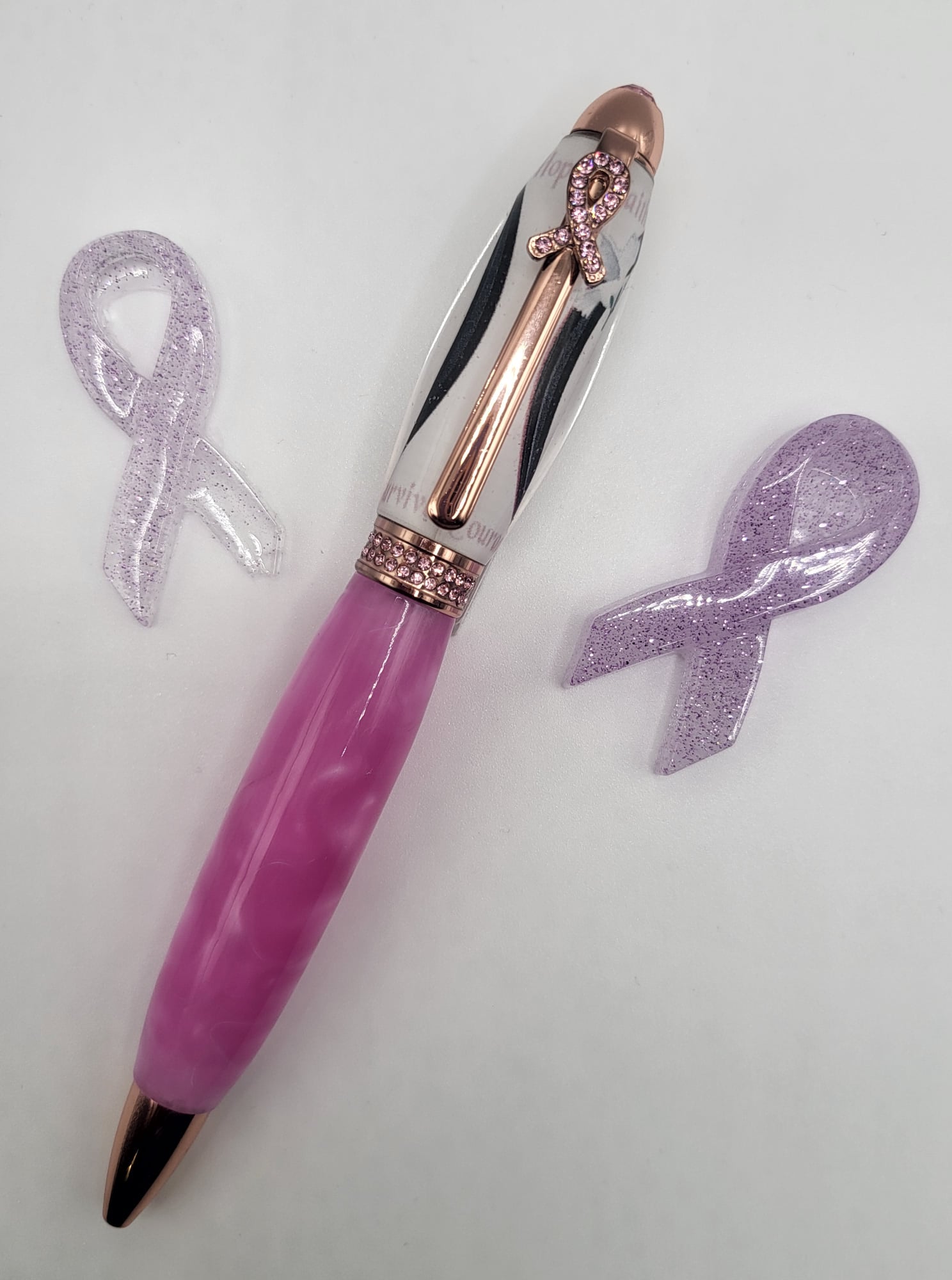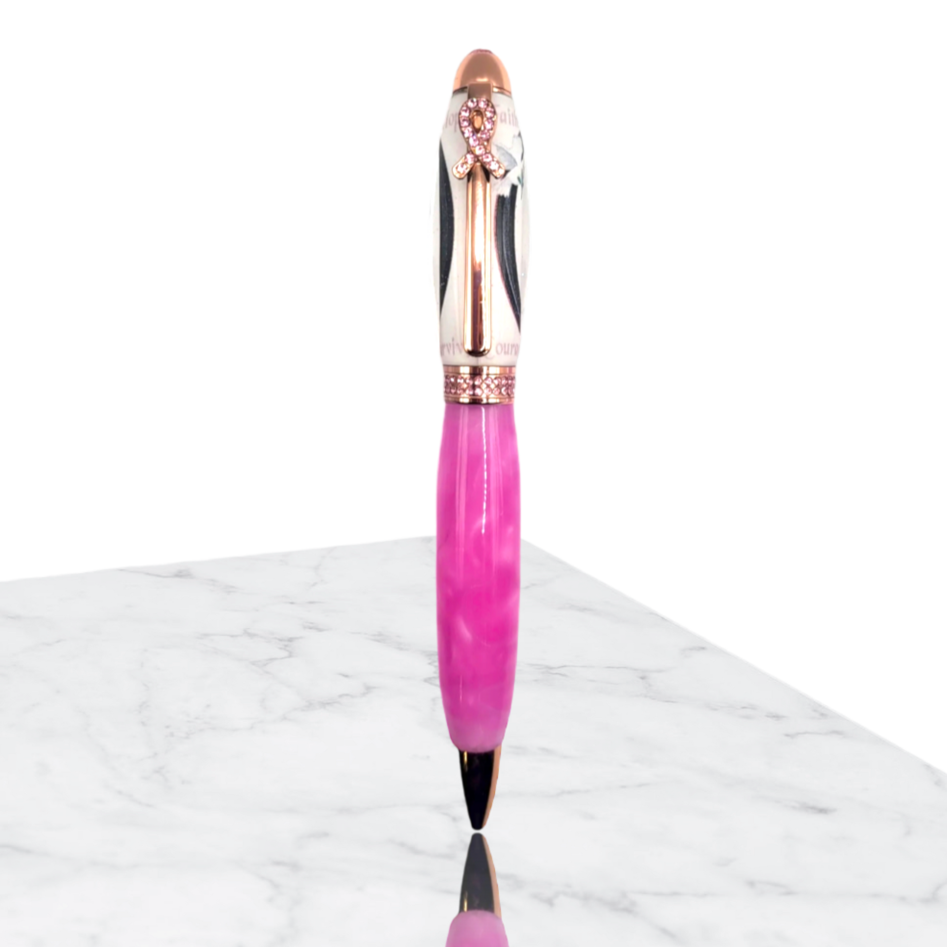 Express your solidarity and let the world know how much you care about a cure for breast cancer with this meaningful pen. Its unique design sparkles with a Swarovski® -pink crystal accented breast cancer awareness ribbon on the pen clip. More Swarovski® pink crystals around the pen band and a larger Swarovski®-pink crystal on the pen end round out this graceful design. When making this pen, you need both 8mm and 3/8 drilled blanks for the complete pen.